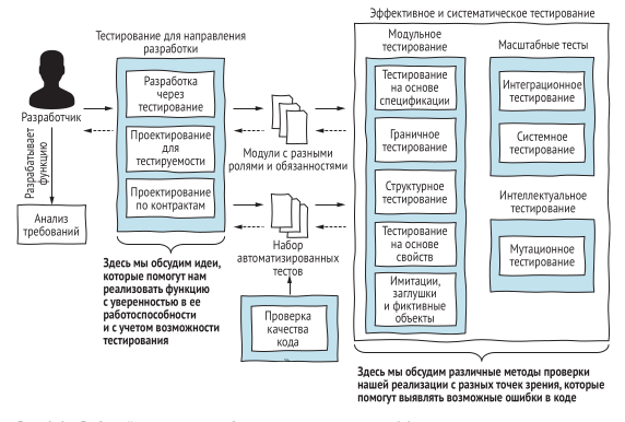 Практически в самом начале книги появляется иллюстрация процесса разработки, которая по сути представляет и общее содержание книги, её план, если можно так сказать. Какие-то главы, будут раскрыты не полностью, как минимум по тому что сам по себе материал в них обширный, но в целом книга получилась содержательной. Прикольно то, что в описании фигурируют, цитирую: - “предметное, граничное и структурное тестирование”. При этом я вообще не знаю, что это такое предметное тестирование. Пошел в Вики, там тоже тишина… Уже позже выяснил, что речь идёт о тестировании предметной области (domain testing), термине, который существует, но используется не слишком широко. Дальше в книге эти подходы раскрываются подробнее.